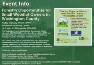 Maine Woodland Owners Association and the Washington County Soil & Water Conservation District will hold a Forestry Opportunities for Small Woodlot Owners in Washington County program at the Hillgrove Community Center in Whitneyville, ME on February 27th from 1 to 2 pm.