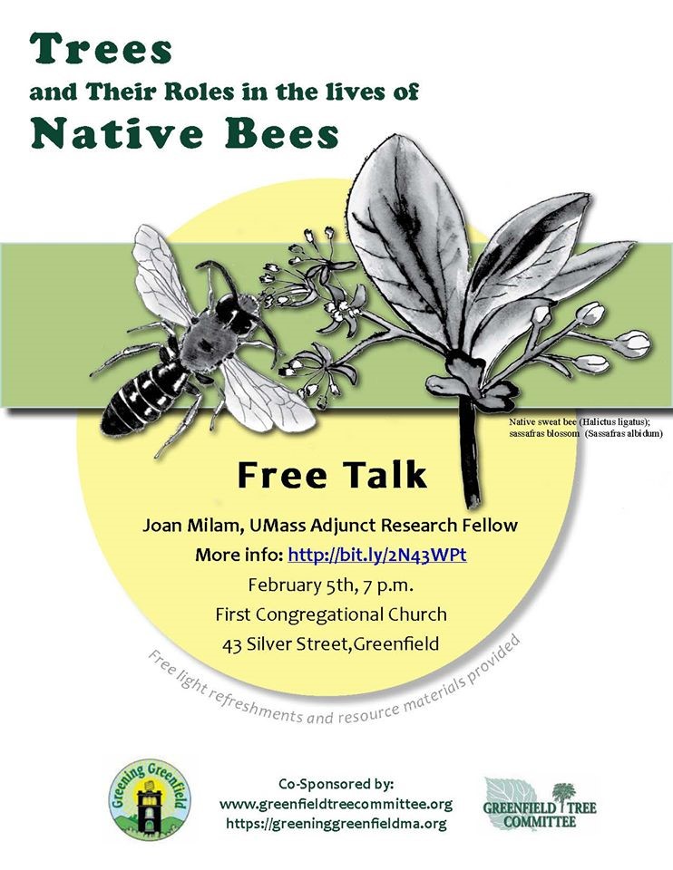 The Greenfield Tree Committee is hosting a free talk by UMass scientist Joan Milam on Trees & Their Roles in the Life of Native Bees on Wednesday, February 5th at 7 p.m. at the First Congregational Church in Greenfield.